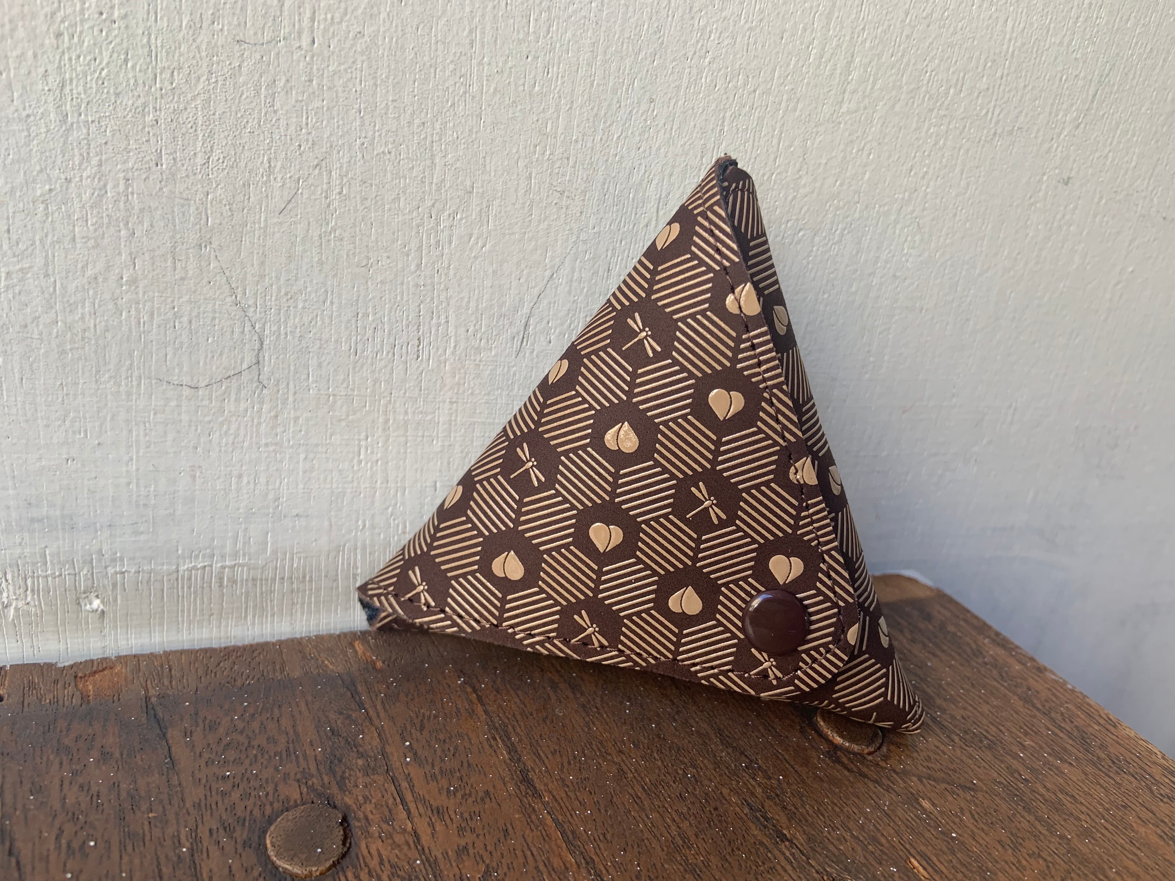 平行四辺形の革の両端にホックを付け三角形に折りたたんだちょっと不思議な形の小銭入れ。