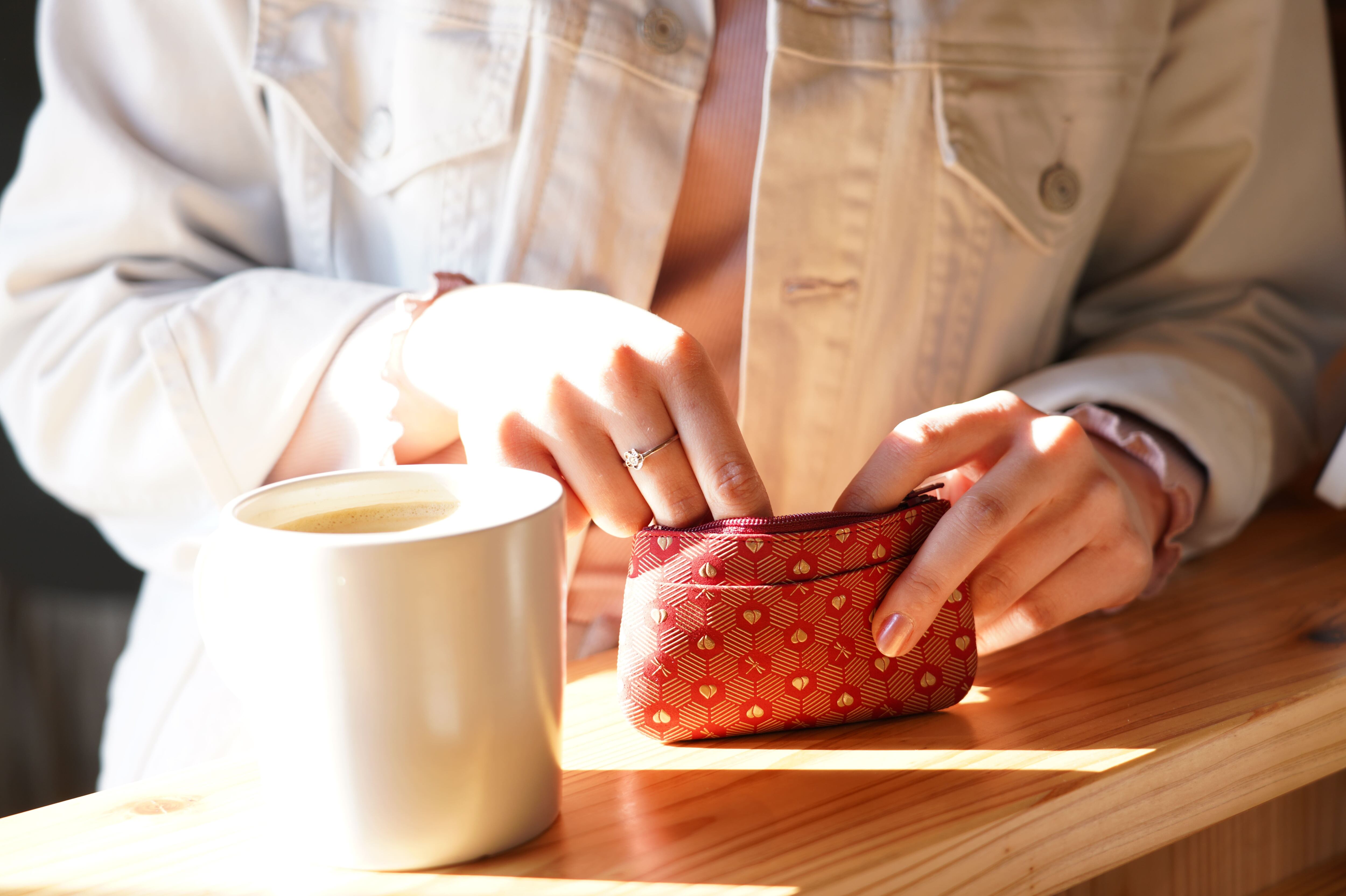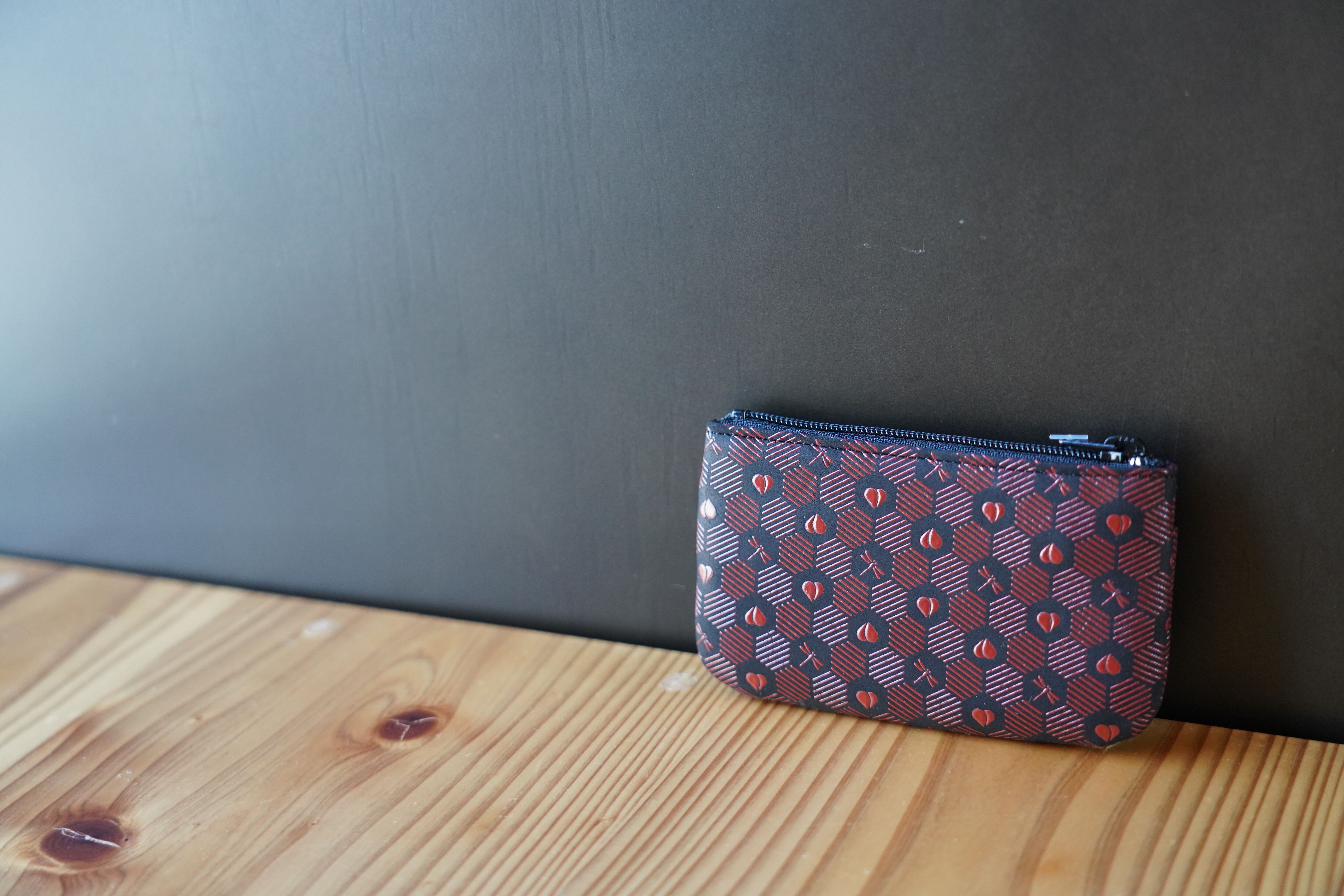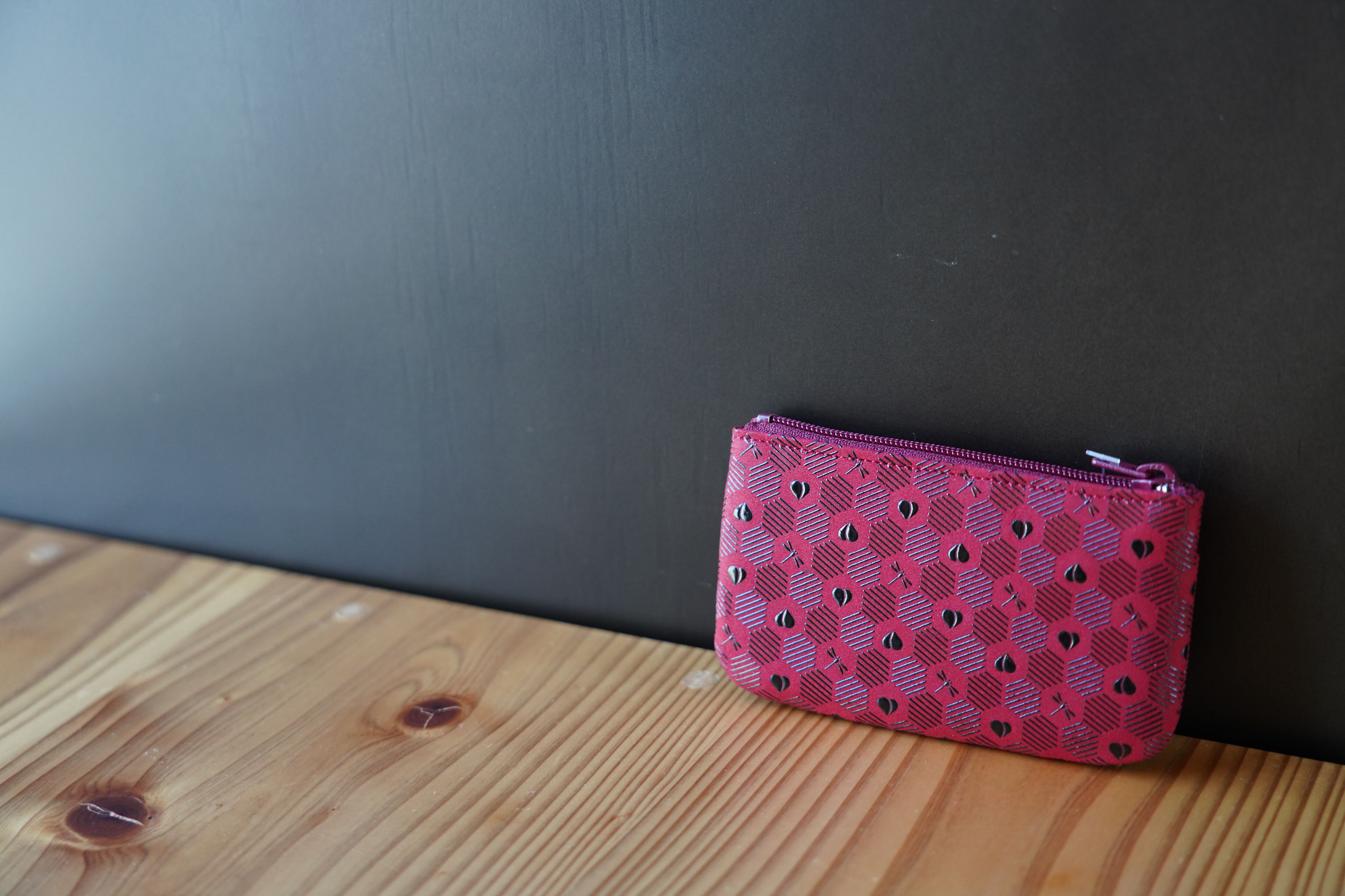 女性の手のひらサイズの使いやすい小銭入れ。外側についたポケットにはよく使うカードやレシートなどちょっとしたものを入れておくのに便利です✴︎