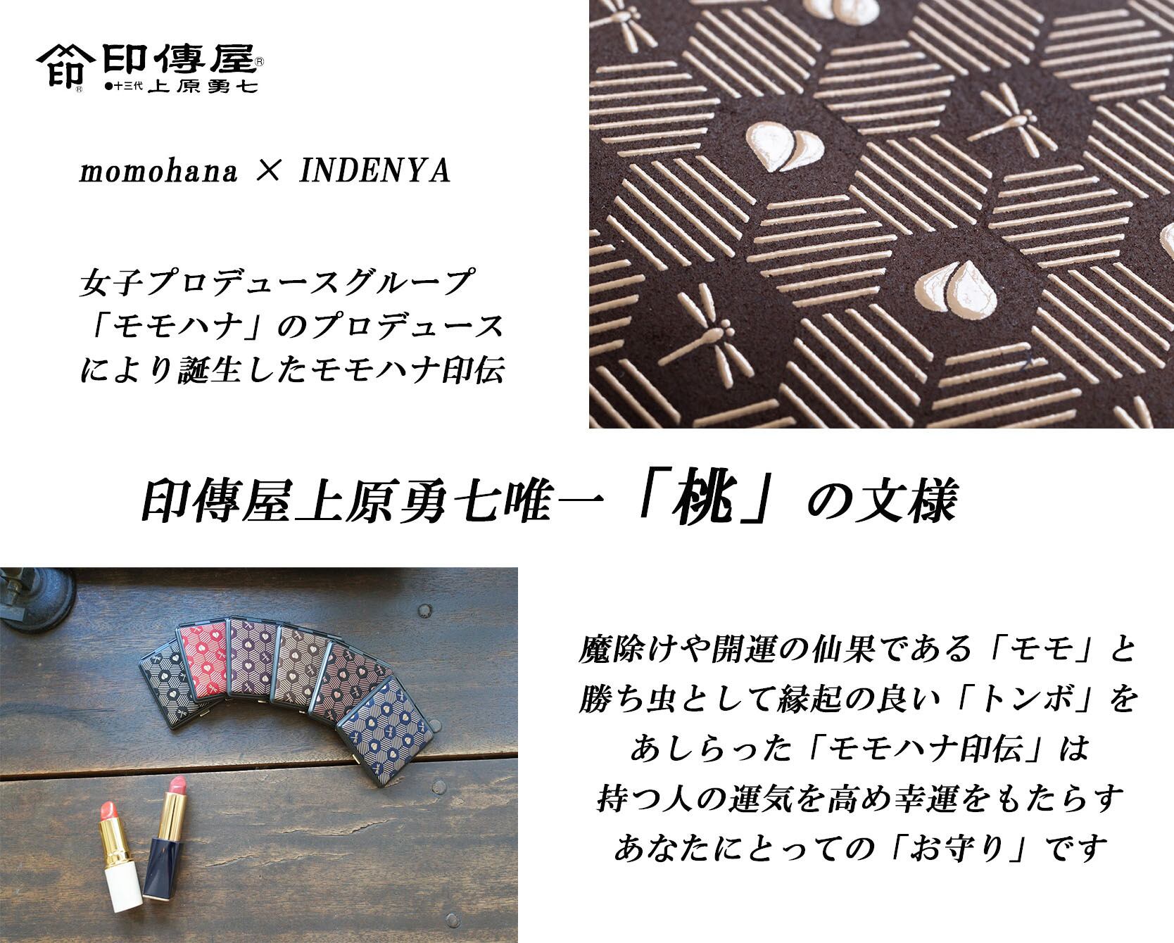 今回印傳屋上原勇七さんとコラボレーションしたモモハナ印傳には、中国で古来より縁起が良いとされている“桃”と、勝ち虫として知られる“トンボ”がデザインされています。これから社会に出ていく女性たちが持っているだけで「お守り」となるように、という思いが込められたデザインです。